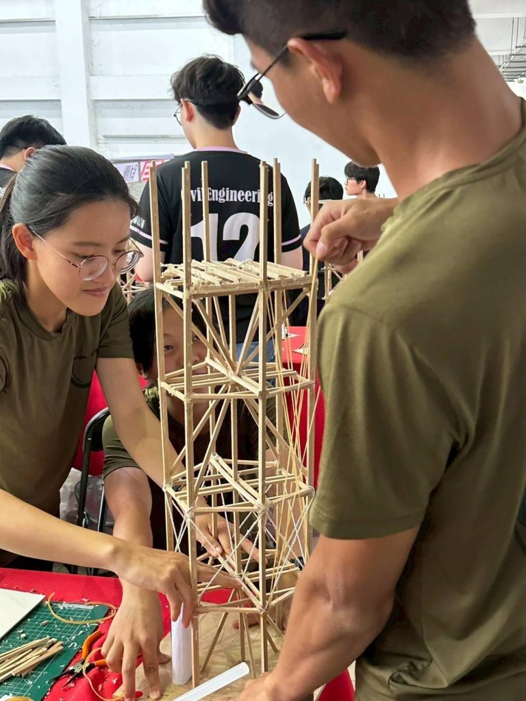 孫子兵法〈上下同欲者,勝。〉在競賽現場限時的極致壓力下,陸官團隊的分工合作展現出高度的默契與效率。從最初的藍圖繪製、結構的黏合接點,到細緻入微的穩定性反覆檢視,每一環節都凝聚著大家的專注與耐心。陸官土木系學生不僅是工程師,更是富有藝術家精神的工匠,力求將每一個接合點處理得天衣無縫,將力學原理融入結構的每一處肌理。