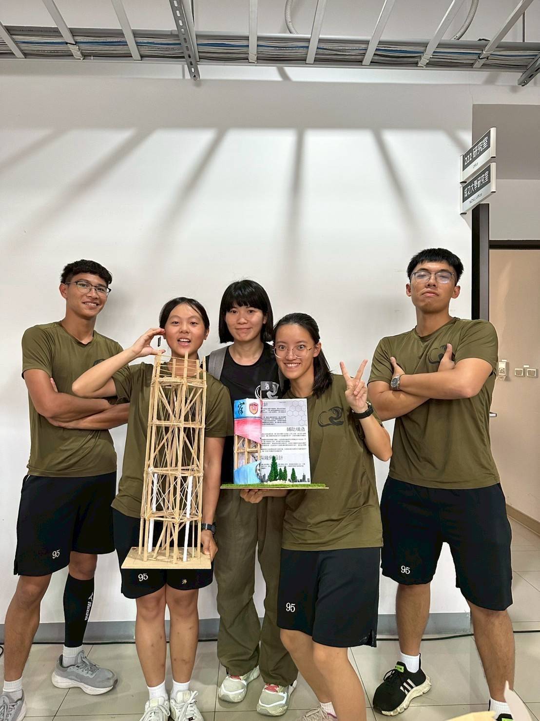 在國際競賽的舞台上,考驗的不僅是理論知識,更是臨場應變與實作能力的嚴苛挑戰。陸官四位同學歷經數月深思熟慮的設計與無數次的模擬,最終以簡潔卻充滿力量的木條,搭構出心血結晶。他們將抗震信念化為一根根精準裁切的木材,透過一道道精密交叉支撐,構築起一道抵抗自然界最狂暴力量的堅實屏障。