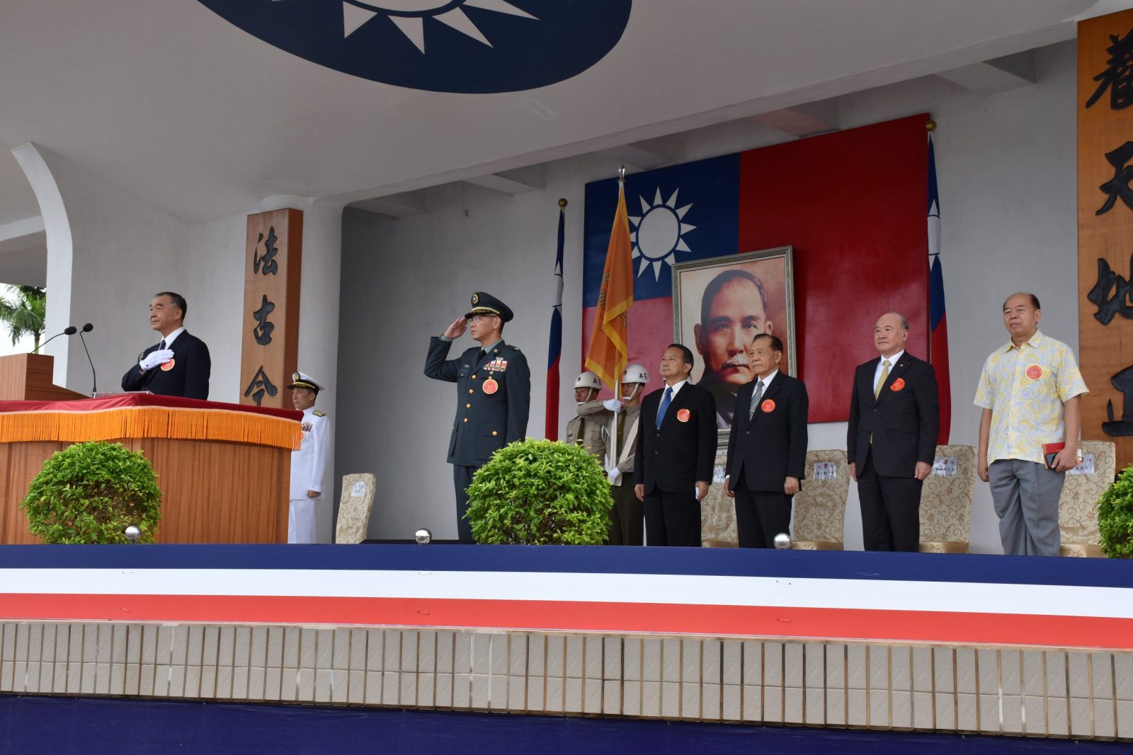 【本刊訊】黃埔建軍暨陸軍軍官學校建校99週年校慶典禮,由國防部長邱國正上將親臨主持,前總政戰部主任鄧祖琳上將、總統府戰略顧問霍守業一級上將、曾金陵上將、歷任校長、陸軍官校校友總會長羅際琴中將及校友基金會沈慶光董事長率丁廣欽董事代表汪忠一、董事楊國強、林自強、甘光伯、章宏琦、顧問沙永存、程運通一行、國防大學校長、陸軍司令、空軍司令及海軍副司令、各國駐華武官、烈士遺族與地方民代等受邀參與校慶典禮,共同感受黃埔建校99週年的輝煌新頁。 校慶典禮中,邱部長在雨中親自校閱地面部隊,天空時而放睛,時而飄雨,接序分列式由巨幅國旗展旗展開,官校﹁黃埔、南京、成都、鳳山﹂等四個時期的服飾車隊,以及校友連、各軍事院校學生連、機步二三四旅及官校學生正步連等一千四百位參訓官兵依序進場,展現﹁三軍一體、同根同源﹂的黃埔精神。