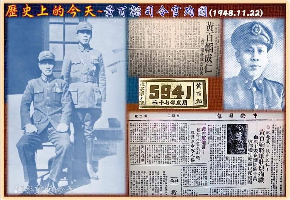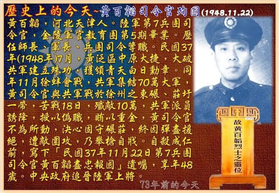 同年11月徐蚌會戰,黃司令官苦戰18日,期間共軍派員誘降,並授以偽職賄以重金,黃司令官仍不為所動,決心固守碾莊。此役雖擊斃共軍約十萬人,仍然不敵共軍採人海戰術行波浪式衝擊,最終彈盡援絕,黃司令官於22日留下「民國37年11月22日第七兵團司令官黃百韜盡忠報國」遺囑後,舉槍自戕,享年48歲。