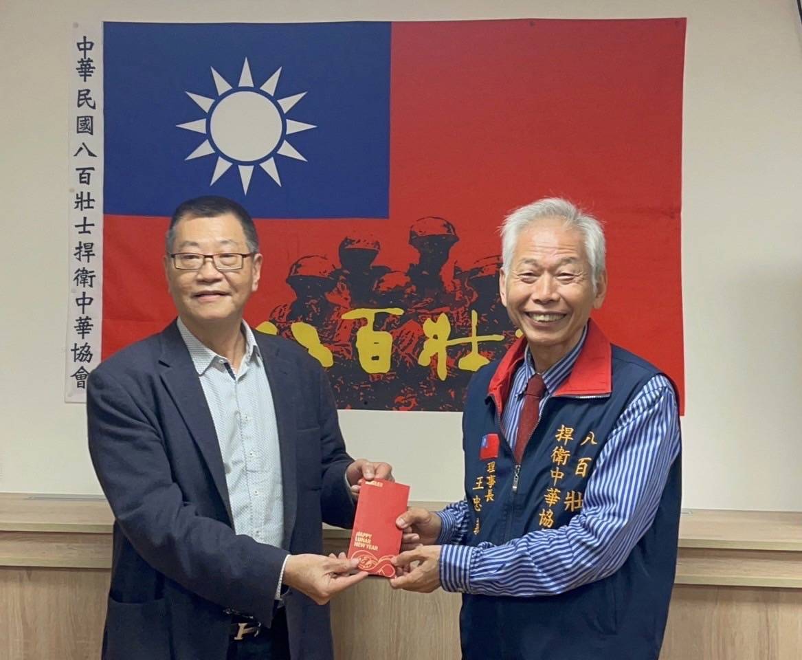 在八百壯士捍衛中華協會顧問團暨志工感恩茶會上,校友基金會沈慶光董事長捐款贊助協會,由理事長王忠義將軍代表接受,大家一起努力,為軍公教警消權益福祉發聲,為中華民國的未來持續奮鬥。