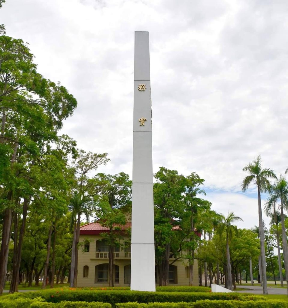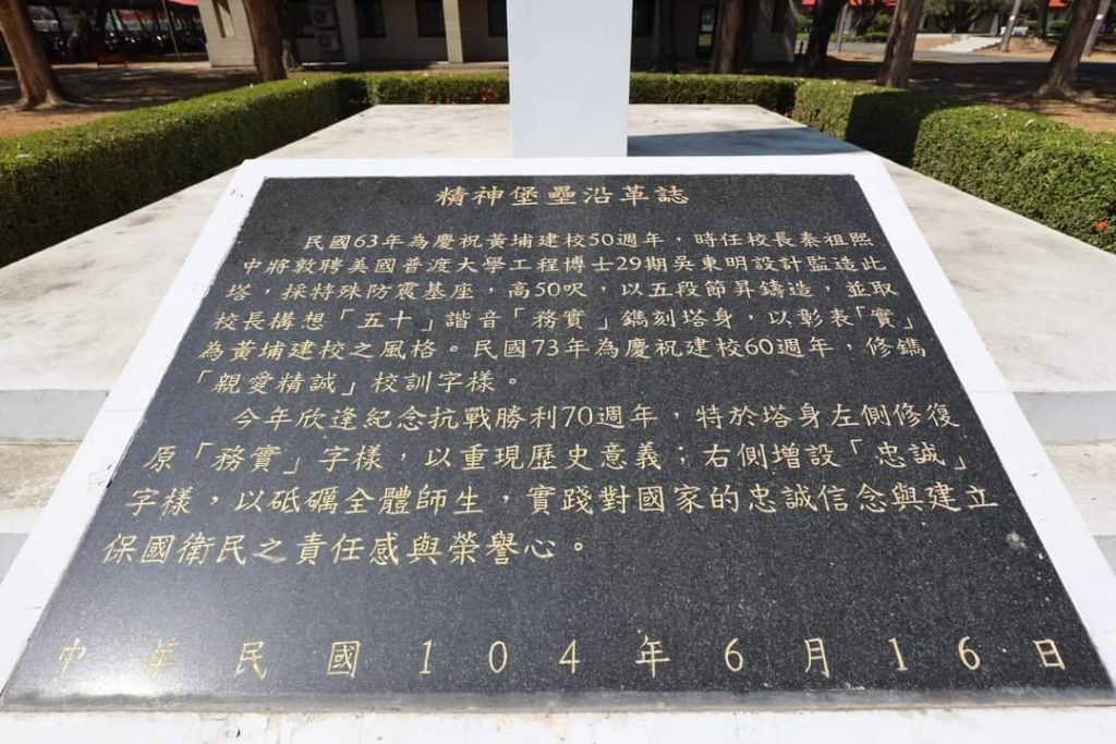 民國63年(1974年)慶祝建校五十週年,特於校門右側建立「務實塔」精神堡壘乙座,高50呎,白色塔身每10呎為一層,共計5層,每一層代表一個10年,以呈現黃埔建校50年之意涵,並於正面呈現「50務實字樣」,以茲惕勵。