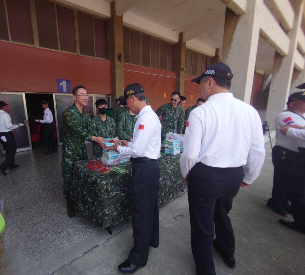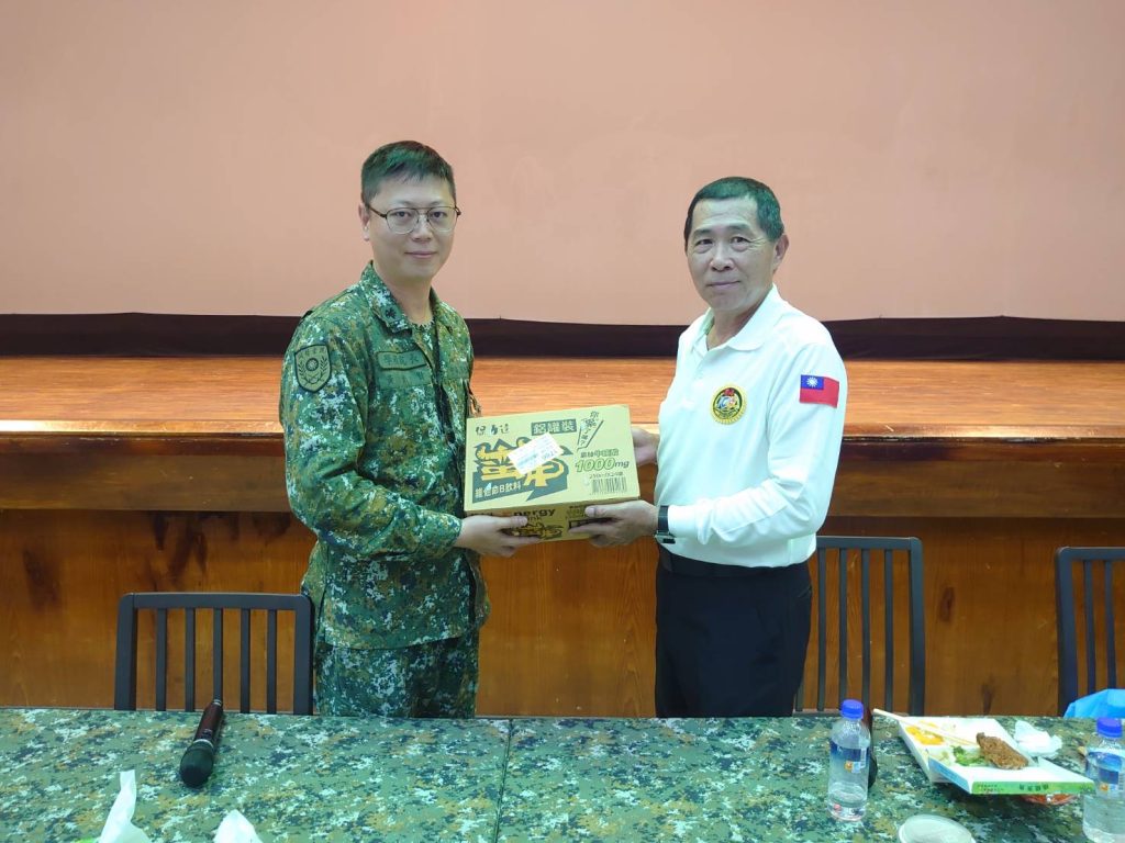陸軍官校學務處長黃齡賢上校代校長致贈運動飲料給隊員。