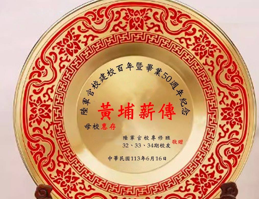 為慶賀母校建校百年生日,32、33、34期用心採購紀念盤乙座提前於6月13日下午14時,由33期榮譽會長張福安偕同方擎國同學與34期代表劉金煌、30期陳增吉共同見證下,圓滿完成致贈儀式,也提前敲起了祝賀樂曲。感謝陸軍官校校長余劍鋒將軍撥冗親自全程接待,政戰主任朱桓麟上校、學務處長黃齡賢上校在場陪同。