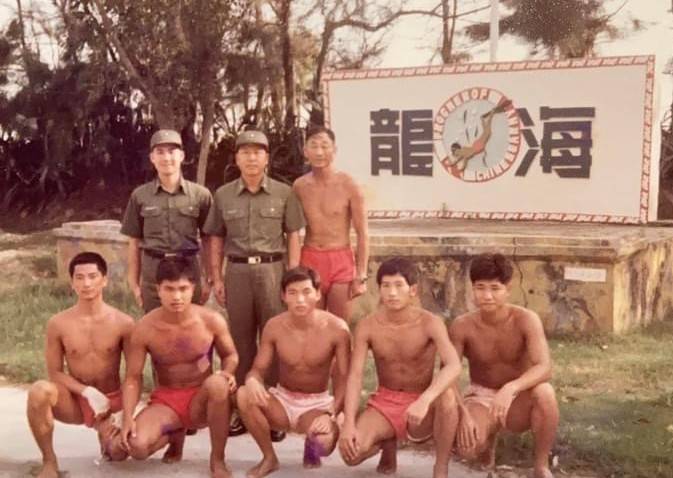 運校校長李一華將軍(後排中)、中華民國首任少將營長劉雨成(後排右)、筆者(後排左)與海龍蛙兵弟兄合影。