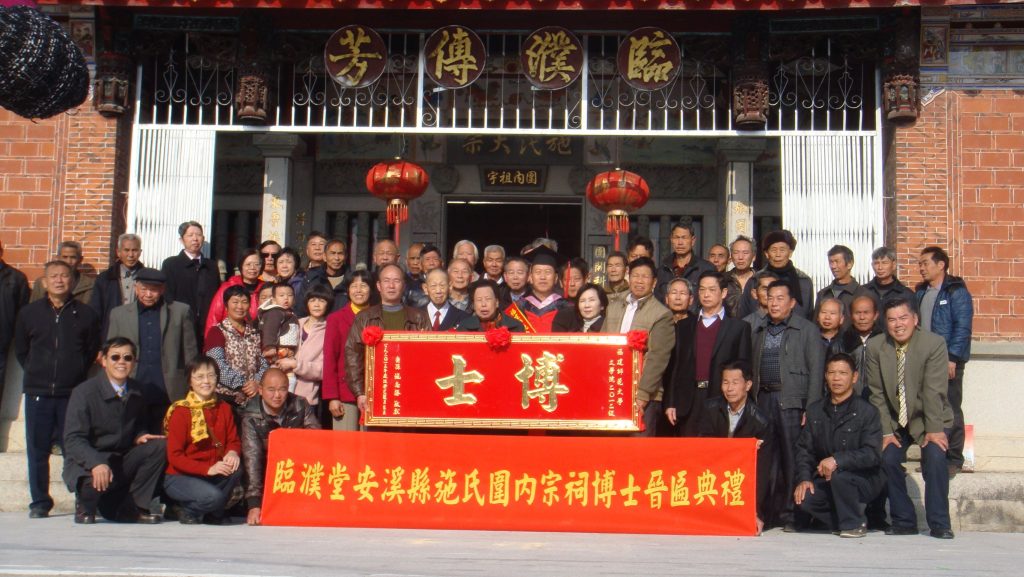 宗祠是同宗親人活動、聚會的場所,也是舉行一宗一姓祭典的場所,同時也是維繫族人親情、教育子孫後代的精神家園。有功名的家族,都會把歷代祖宗的進士乃至舉人的匾額高高懸掛,這是一宗一族的驕傲。現代社會,沒有了科舉,但在學位之中,數博士最高,晉博士匾已經成了金門的傳統;身為第一位返回福建安溪宗祠晉匾的博士,告慰祖先,啟迪後進,余願足矣。