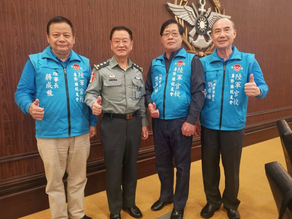 陳君甫學長(右二)與前國防大學校長王信龍上將(左二)、陸官專修班校友會理事長蔣成龍(左一)和陸官專修33期劉忠桓將軍(右一)合影。