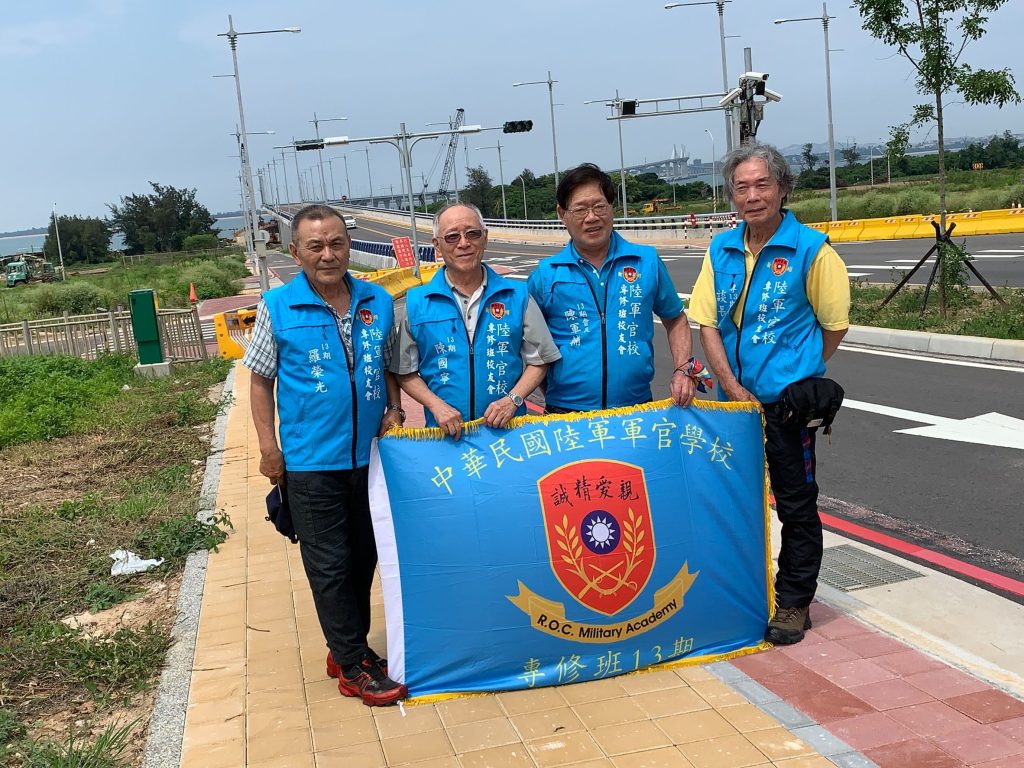 參訪金門戰地,陳君甫學長(右二)與軍校同學攝於金烈大橋前。