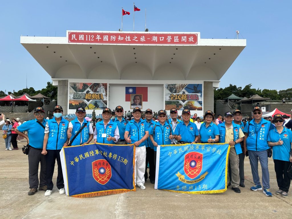 民國112年國防知性之旅湖口營區開放,陳君甫長會長(前排左五)率陸官專修13期同學會參訪在司令台前合影。