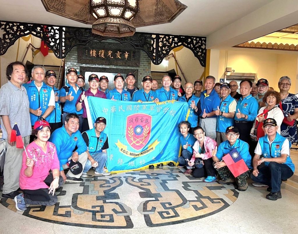 陳君甫會長(左二擎會旗者)與軍校同學暨眷屬在辛亥光復樓前合影。