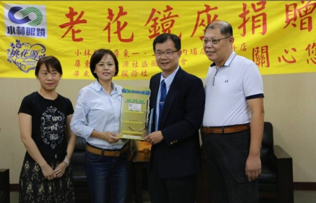 陳增吉學長(右二)代表小林眼鏡屏東分公司捐贈老花眼鏡和鏡座,照顧鄉親民眾眼睛的視力健康。
