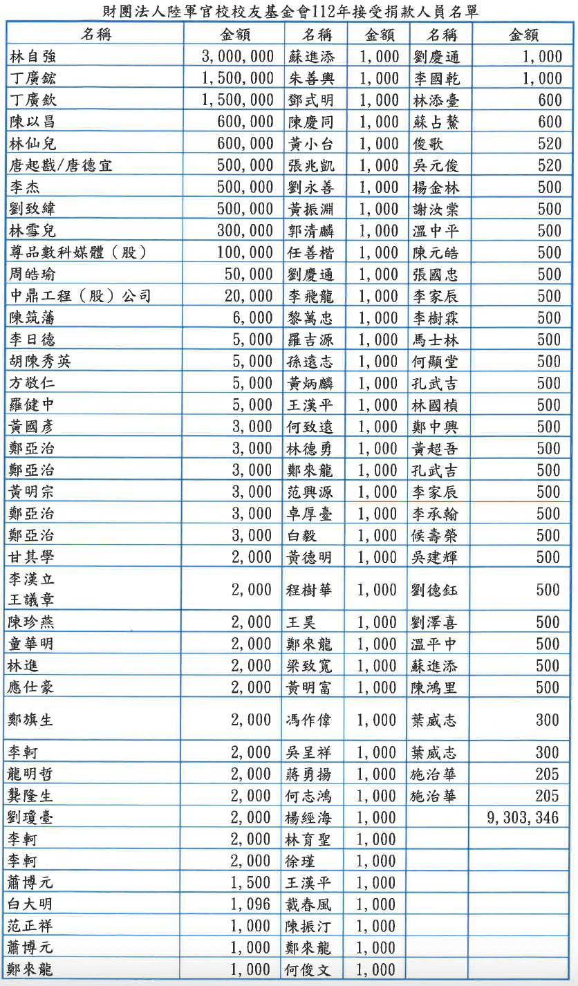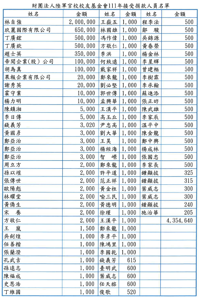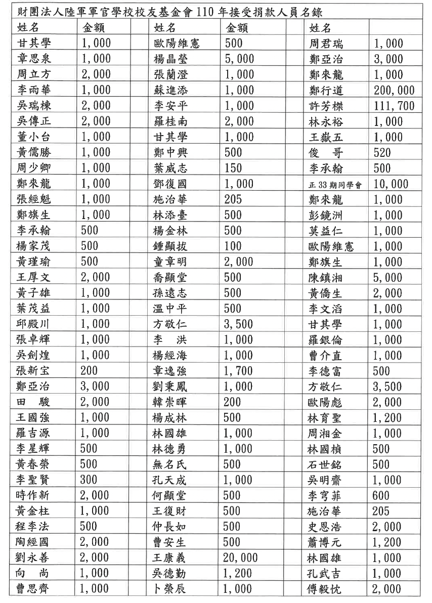 .贊助陸軍官校校友會所辦理之校友聯繫、服務、慰助等公益性事務。