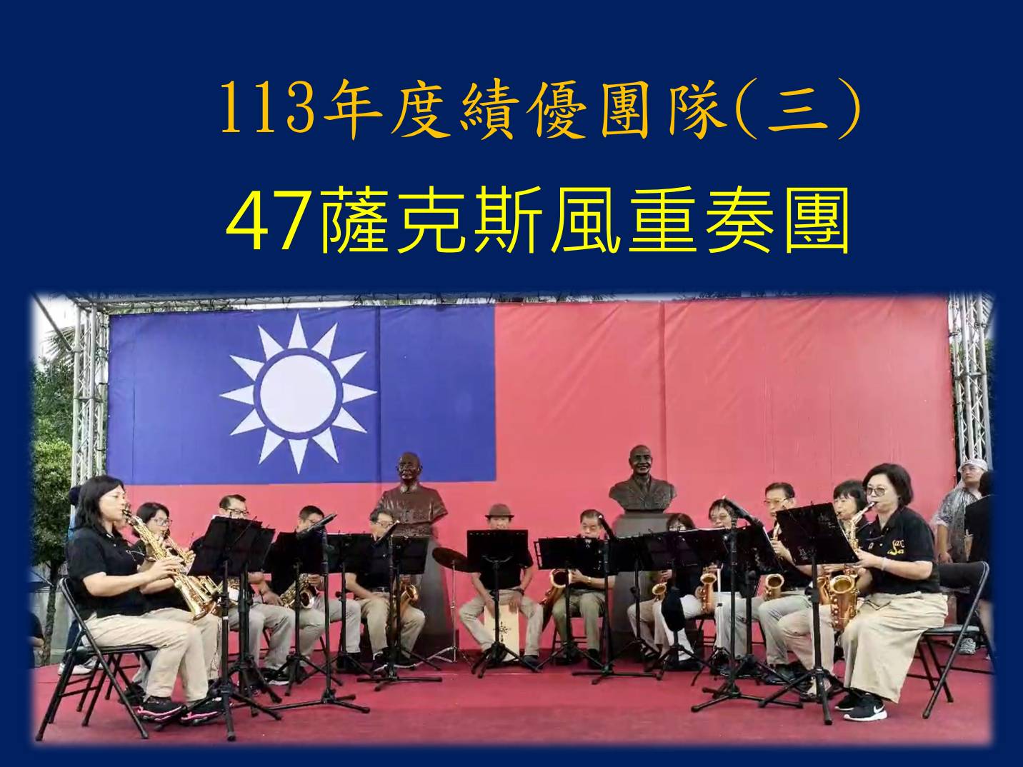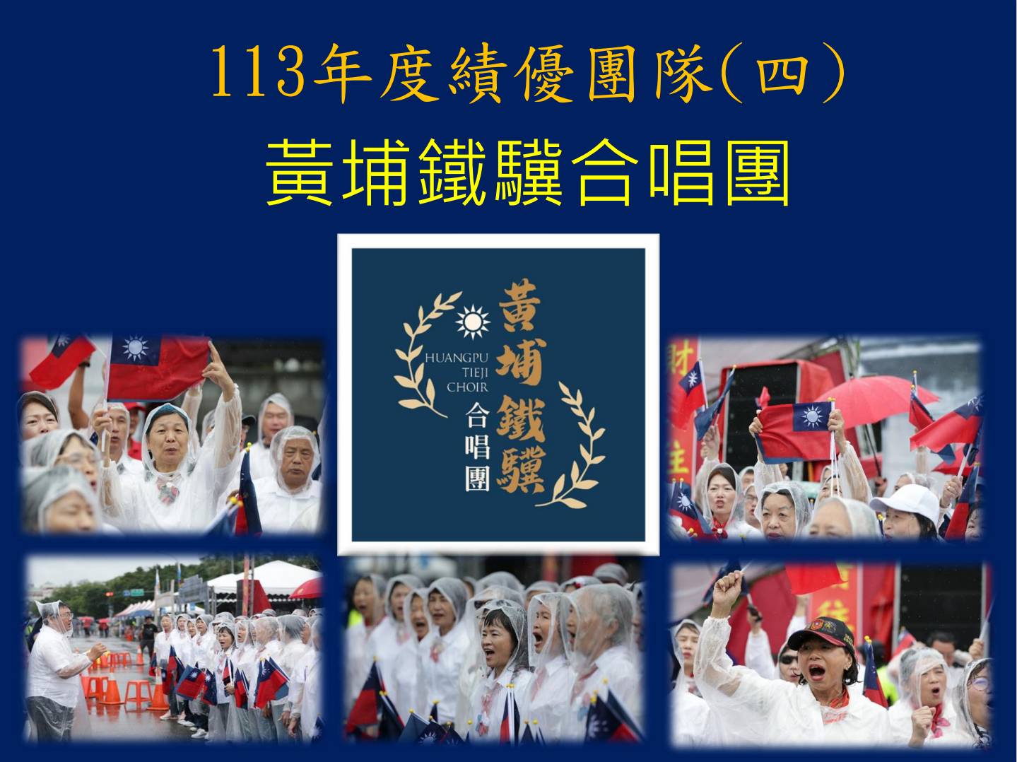 四個績優團體,一是桃園市陸軍官校校友會,二是台中市陸軍官校校友會,皆因一年多來,在黃埔建軍建校百週年系列活動中辦得有聲有色,凝聚了校友向心,也獲得民間、地方的認同;三是47薩克斯風重奏團,四是黃埔鐵驥合唱團,兩團隊在年來的重要大型活動中,都踴躍參與,犧牲休閒時間,不斷練習及配合,磨練技巧與默契,才能帶來歡樂、振奮與士氣,值得表揚。